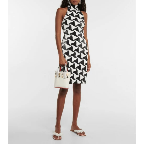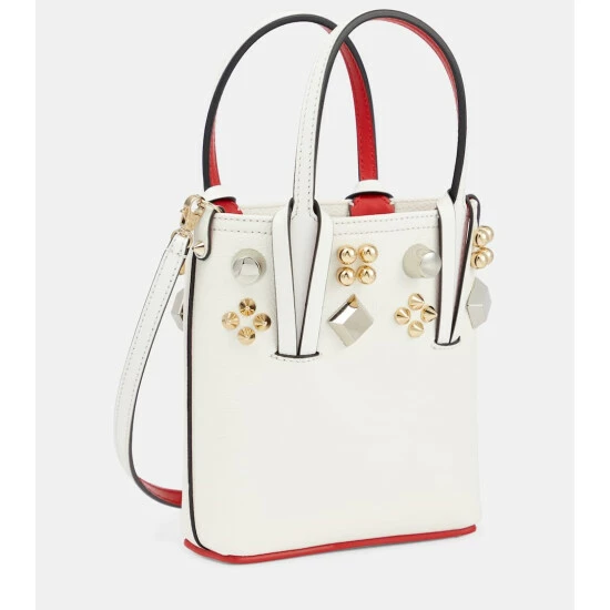 Christian Louboutin reworks the iconic Cabata tote, adorning it with oversized studs set in a regal motif. This design is crafted in Italy from grained white leather and features the label’s signature lipstick-red accents