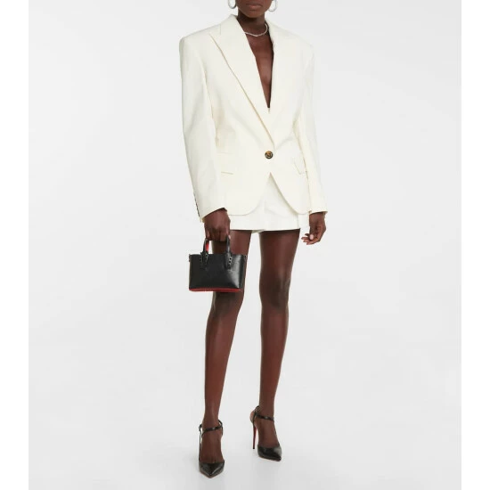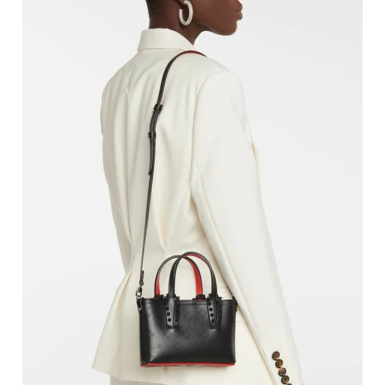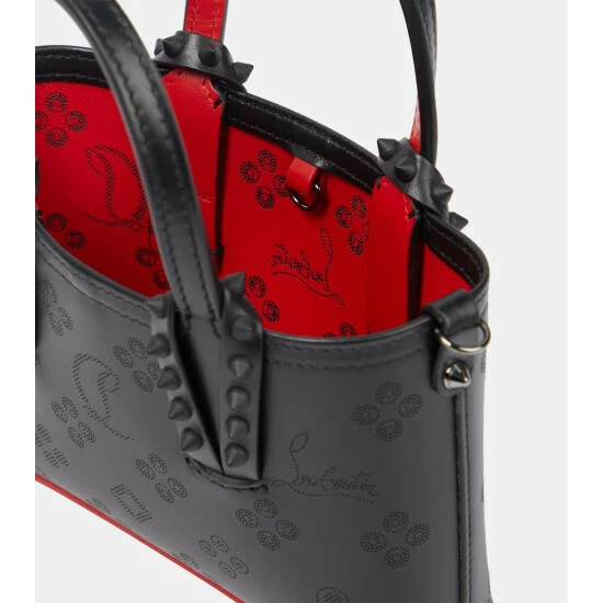 The Cabata Nano tote bag is perforated with insignia synonymous with Christian Louboutin. Made from black leather, it’s embellished with tonal Lou spikes, and has an iconic red lining and rubber sole-inspired base.