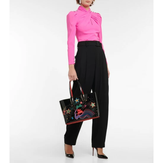 Christian Louboutin’s Cabata tote is crafted from patent leather with a rubber sneaker-sole trim. It belongs to the Las Vegas capsule and showcases a design inspired by the city’s iconic neon hotel signs.