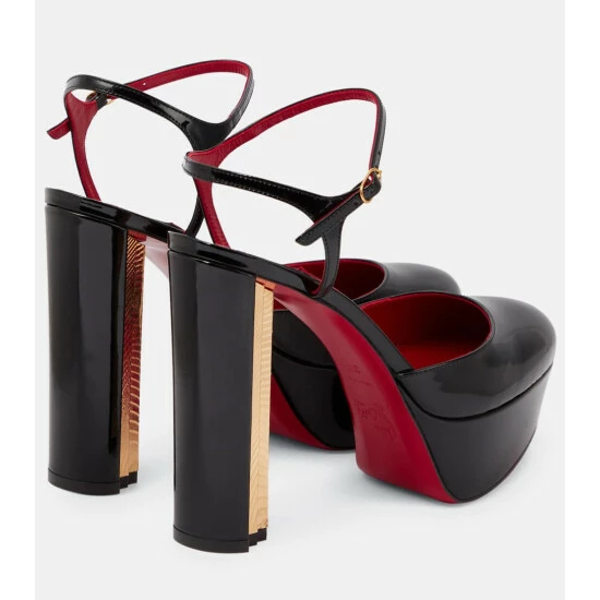 You won’t go unnoticed in the towering Coluna patent leather pumps from Christian Louboutin. They have stepped 130mm block heels inspired by Greco-Roman architecture and slim buckled ankle straps.