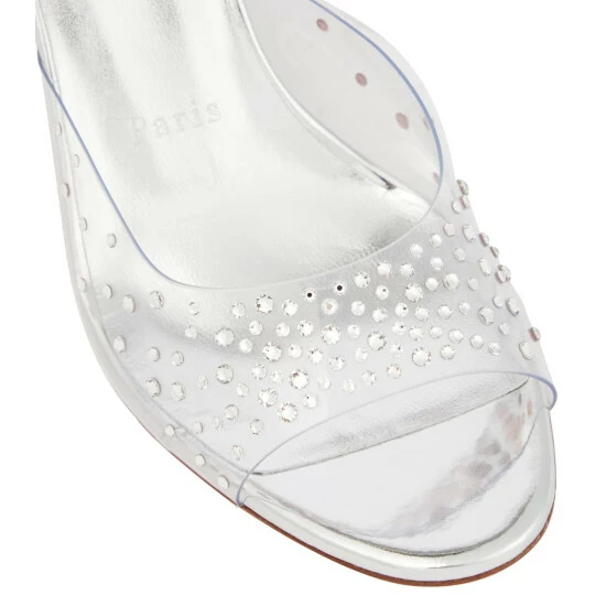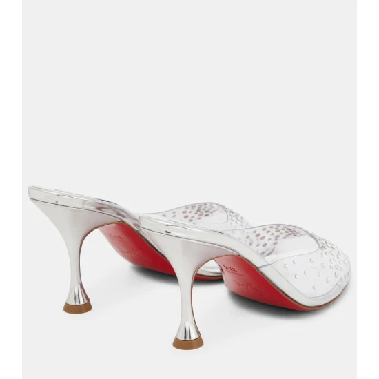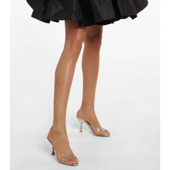 The Degramule sandals are Christian Louboutin’s take on fantasy footwear. They’re capped with crystal-dusted PVC straps and sit on leather-covered heels that flare outwards and are paneled in lipstick red on the inside.