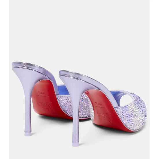 Set on signature red soles, the Dolly mules from Christian Louboutin are made in Italy from metallic lilac goat leather and feature straps coated in iridescent crystals.