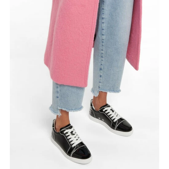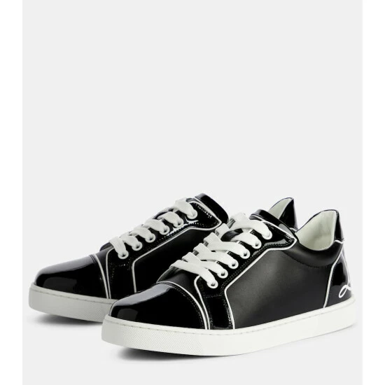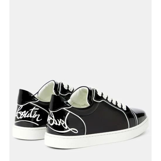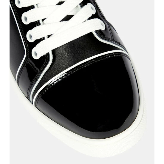 These black Fun Viera sneakers from Christian Louboutin are made from leather with patent paneling. Set on flat rubber soles, they have logo detailing at the heels and lace up fastenings.