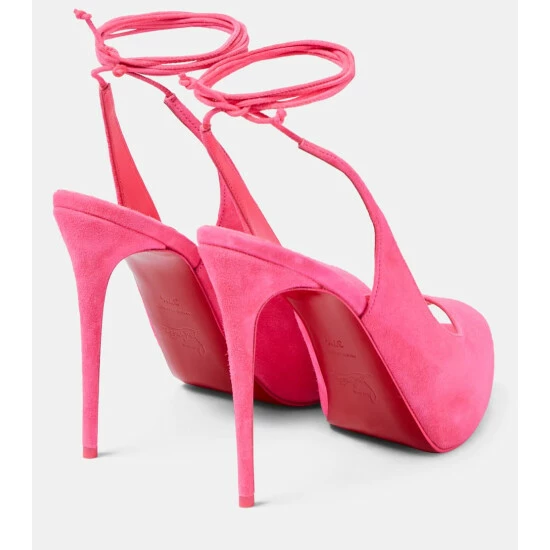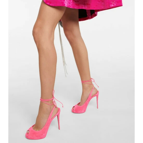 The Lace Up NVP pumps from Christian Louboutin are made in Italy from pink suede and feature peep-toes, slender straps that wrap around the ankles, and signature lipstick-red soles.