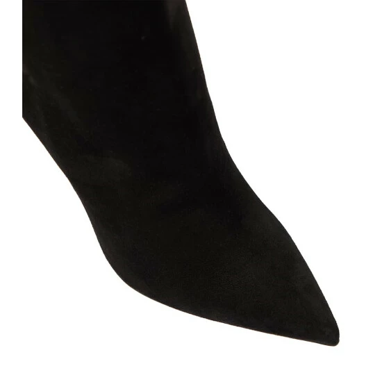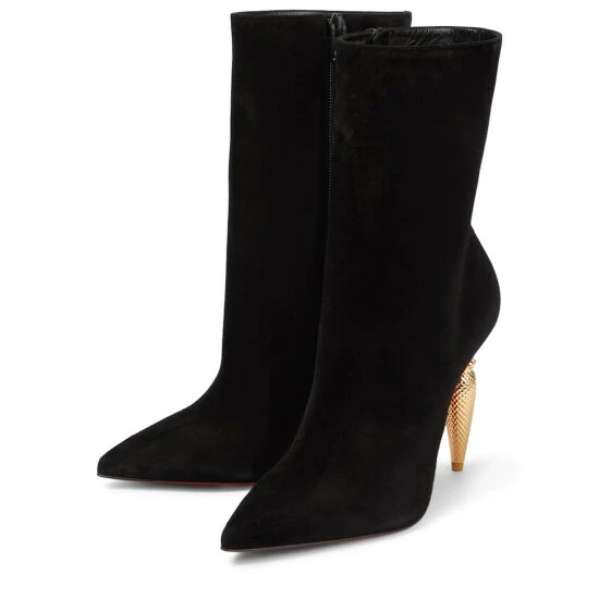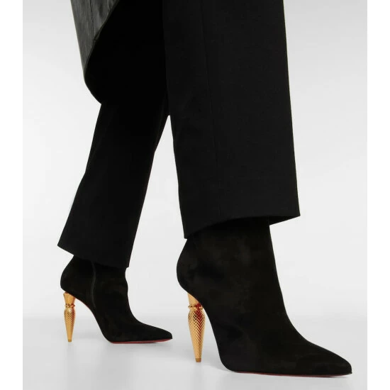 Featuring unique curved metal heels that mirror the label’s signature lipstick bottle, the Lipbooty ankle boots from Christian Louboutin are made from suede and have pointed toes.
