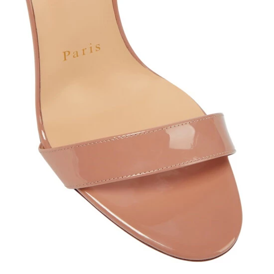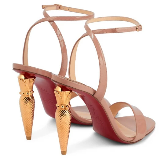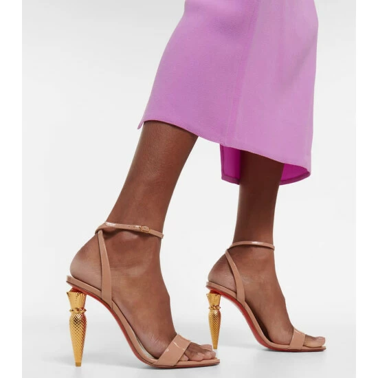 The Lipqueen sandals from Christian Louboutin are crafted from patent leather with dainty buckled ankle straps. They are defined by their textured lipstick-case stiletto heels, which draws inspiration from the house’s beauty line.