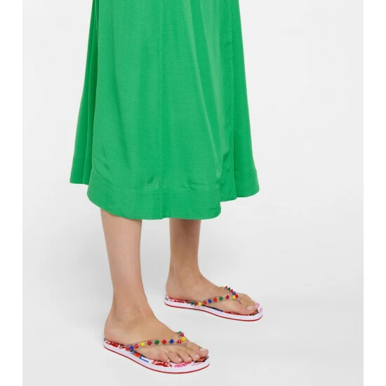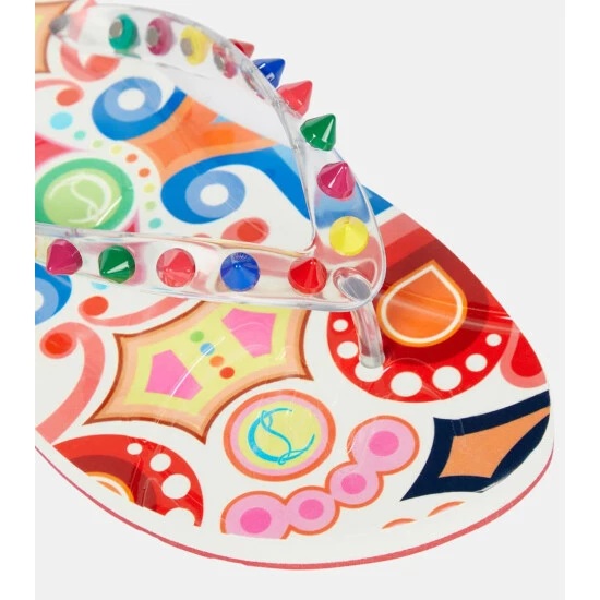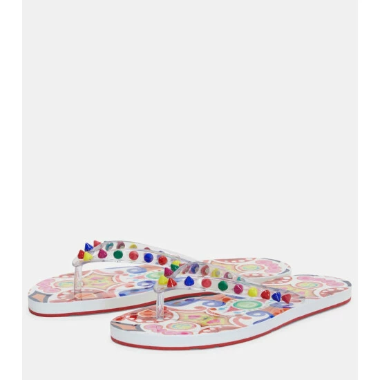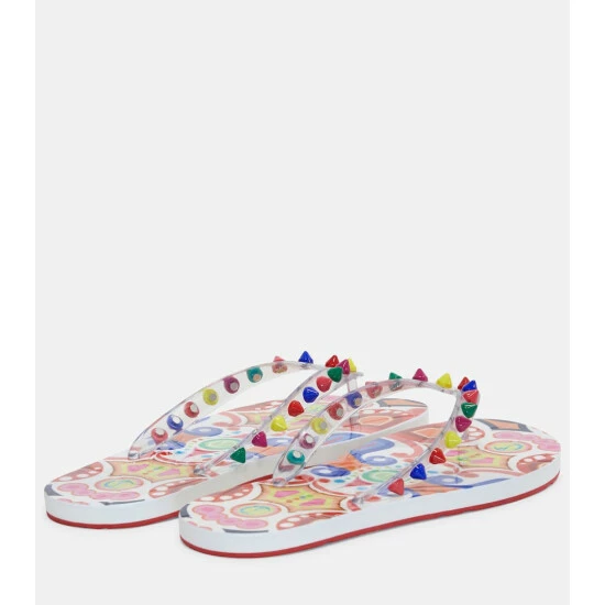 The multicolored Loubi Flip thong sandals from Christian Louboutin’s are decorated with a panoply of studs along the straps for a playful take on tough-luxe. They’re made with rubber soles that are printed with brand insignia and geometric shapes.