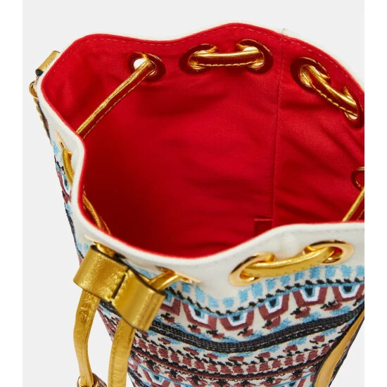 The Loubiphore bucket bag from Christian Louboutin brings to life the illustrations of artist Konstantin Kakanias. The Greek-inspired embroidery is balanced by gold-toned nappa leather trims and a chain strap.