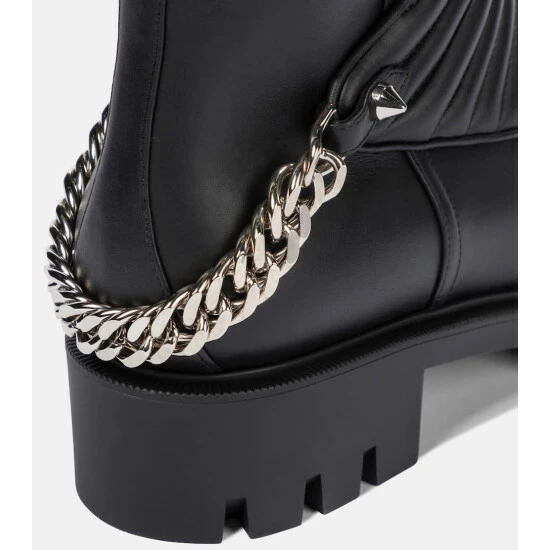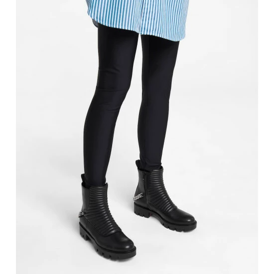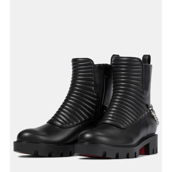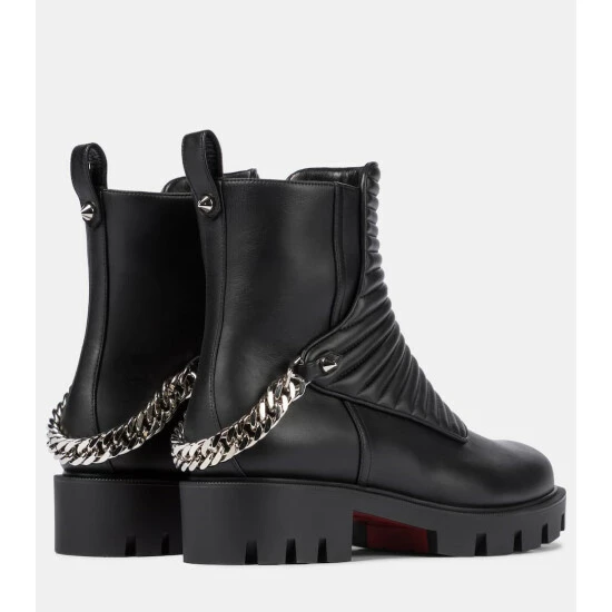 Combat books like this Maddic Max pair from Christian Louboutin are nothing short of essential. This pair’s uppers are made from smooth black leather with ridged, padded vamps for support, and the lugged soles are tinted in label-signature lipstick red. Positively gleaming chainlink harnesses ensure this ankle-height pair will not go unnoticed.