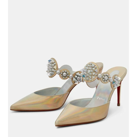 Turn heads in the shimmering Miss Goldora mules from Christian Louboutin. They’re made from calf leather with a metallic finish and feature ornately studded arch straps.