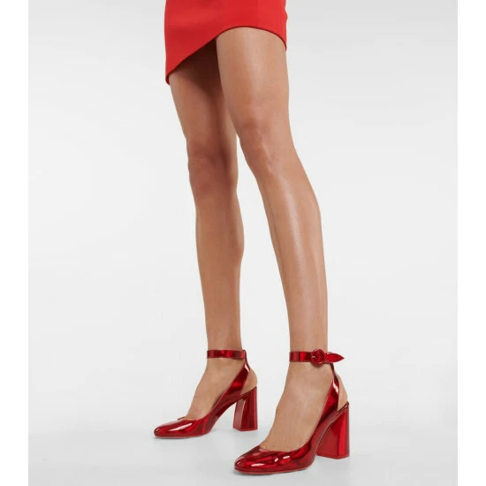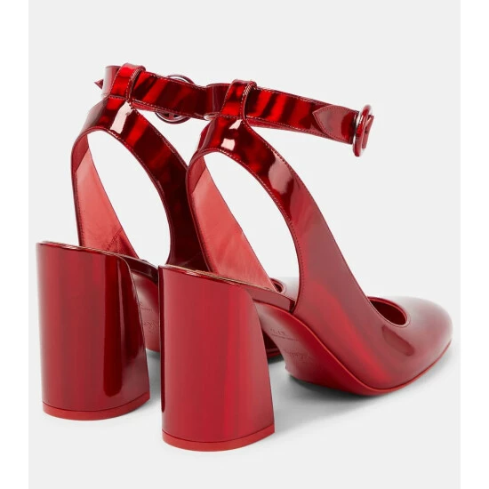 Welcome party season with Christian Louboutin’s Miss Sab slingback pumps, crafted from ultra-shiny patent leather. The round-toed pair has buckled ankle straps and comfy block heels that gently wegde inwards.