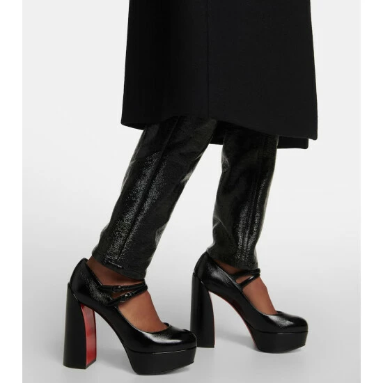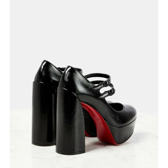 Christian Louboutin’s lacquered red soles are a trademarked feature of the house. The vintage-inspired Movida Jane leather pumps have 130mm block heels, balanced with platform toecaps.
