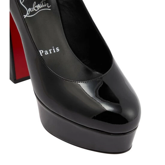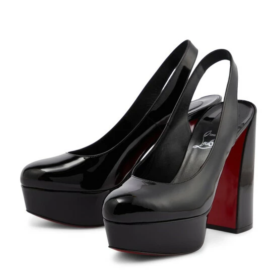 Christian Louboutin’s Movida pumps set shoe standards sky high, just like their platform block heels and soles. They’re made from glossy patent leather with slingback straps, almond toes, and iconic red-lacquered soles.