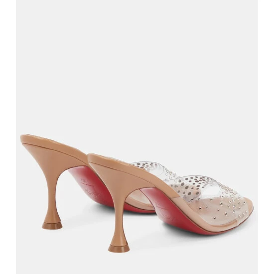 Christian Louboutin designed the Degramule leather sandals exclusively for Mytheresa as part of its Nudes collection. Notice how the crystals on the PVC straps reflect the light-brown color of the insoles and heels.