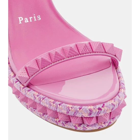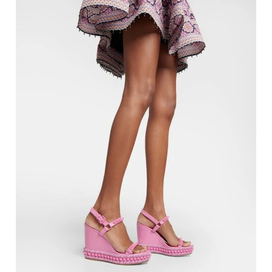 Add an edgy element to any outfit with these patent leather wedge sandals from Christian Louboutin. They stand tall with chunky wedges and platform soles, and feature spike embellishments at the outsoles and straps.