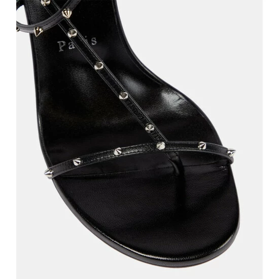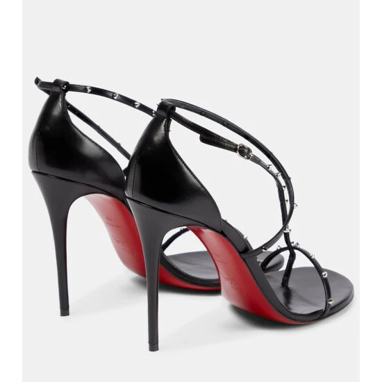 Bring sexy back with Christian Louboutin’s Riojana sandals. This strappy pair is made from black leather with metallic micro-spikes and 100mm stiletto heels.