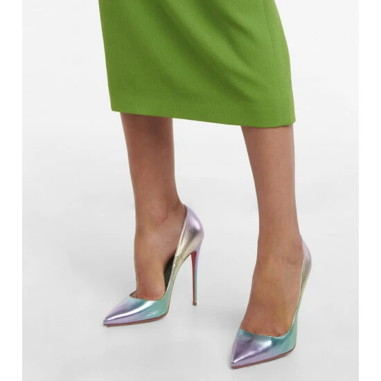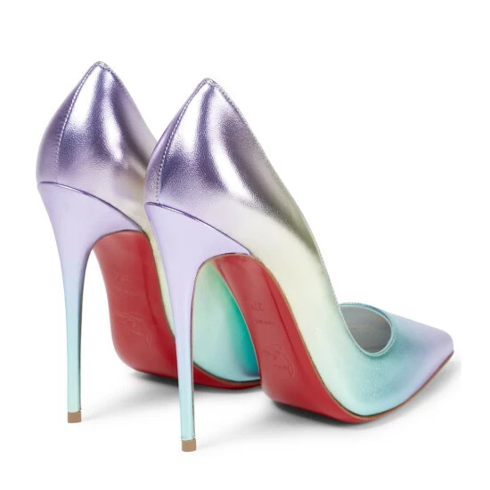 Christian Louboutin updates the iconic So Kate pumps in iridescent nappa leather. They feature pointed toes, 120mm stiletto heels, and the brand’s trademarked lipstick-red soles.