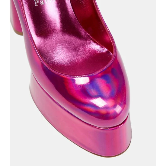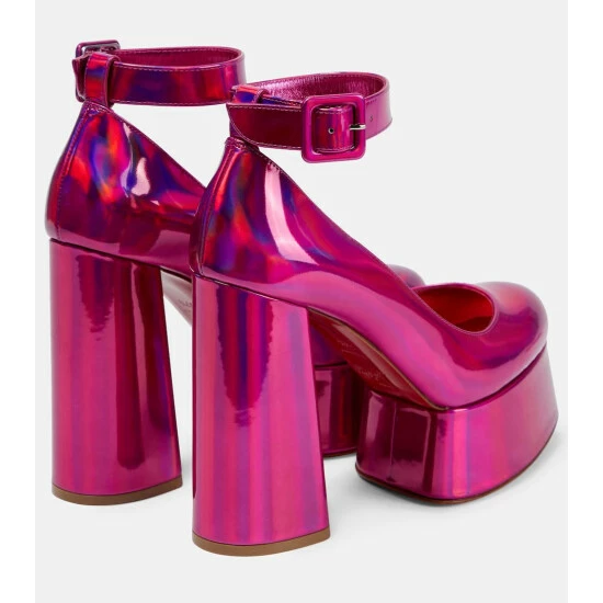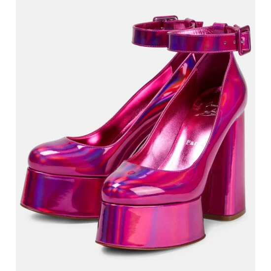 Slip into these platform pumps from Christian Louboutin to get into the party mood. Made from metallic fuschia-pink leather, the eye-catching style has graphic lines, a 130mm square heel, and ankle straps.